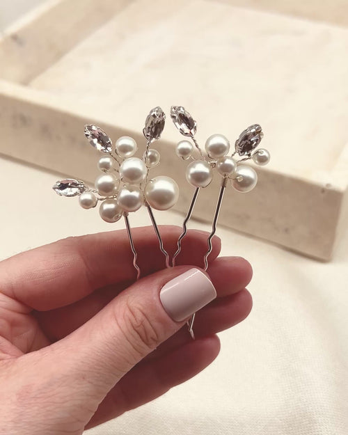 Chic and sparkling, the Annalee Pearl Hair Pins are designed with luminous pearls and marquise-cut crystals that catch the light beautifully. Perfect for adding a polished accent to your bridal updo or scattering through soft waves for modern romance.