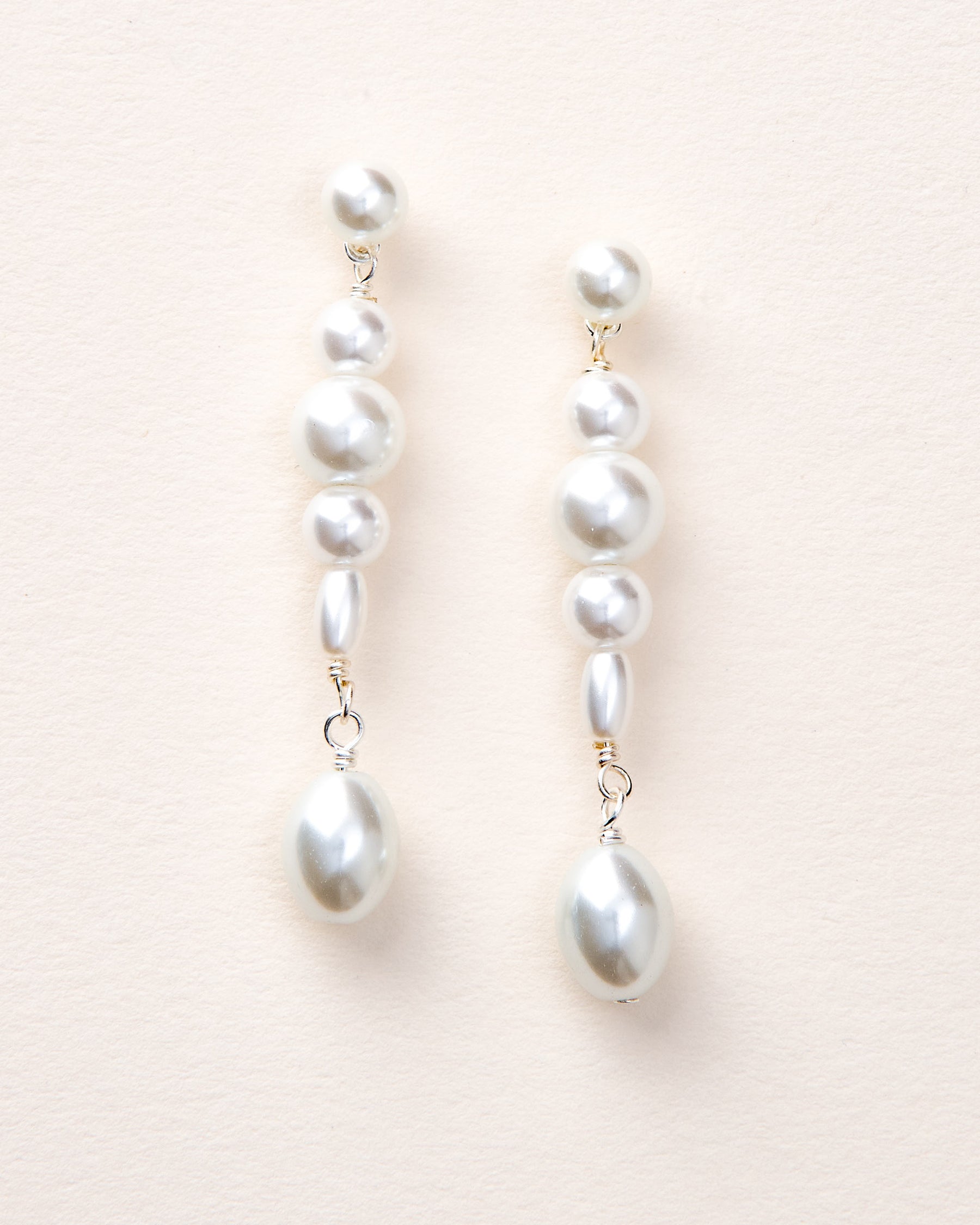 Design: Linear drop earring with soft light ivory pearls in varied sizes and shapes