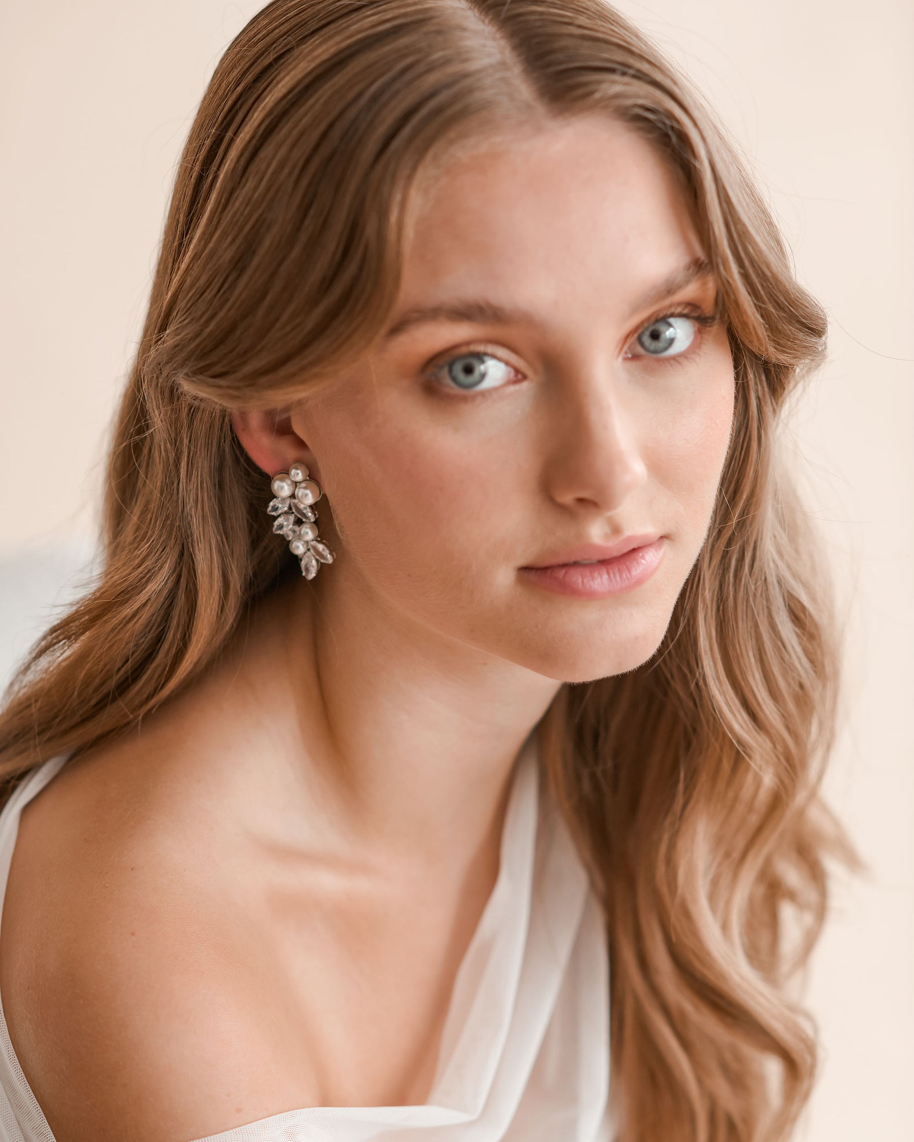 Simple yet breathtaking, the Valencia Earrings are designed for the bride who wants her look to feel luminous, romantic, and unforgettable. A graceful cascade of softly glowing pearls and marquise-cut simulated diamonds catches the light with every movement, creating that quiet wow moment as you walk down the aisle.