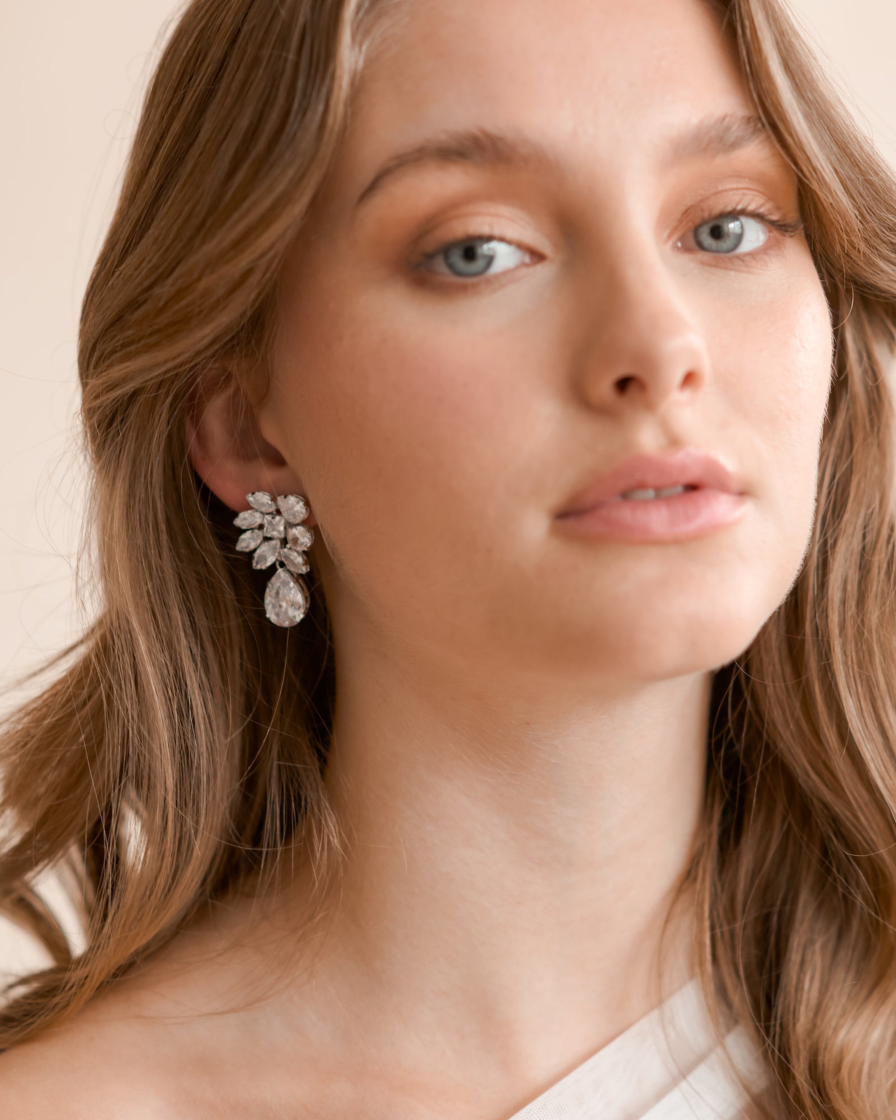 The Vienna Earrings showcase the finest simulated diamonds, hand-set in a dramatic cluster that flows into a teardrop centerpiece. Crafted with premium rhodium plating and an exclusive heart-shaped comfort backing, they balance bold sparkle with refined elegance. From our Luxe Edit, where elevated design meets premium materials.