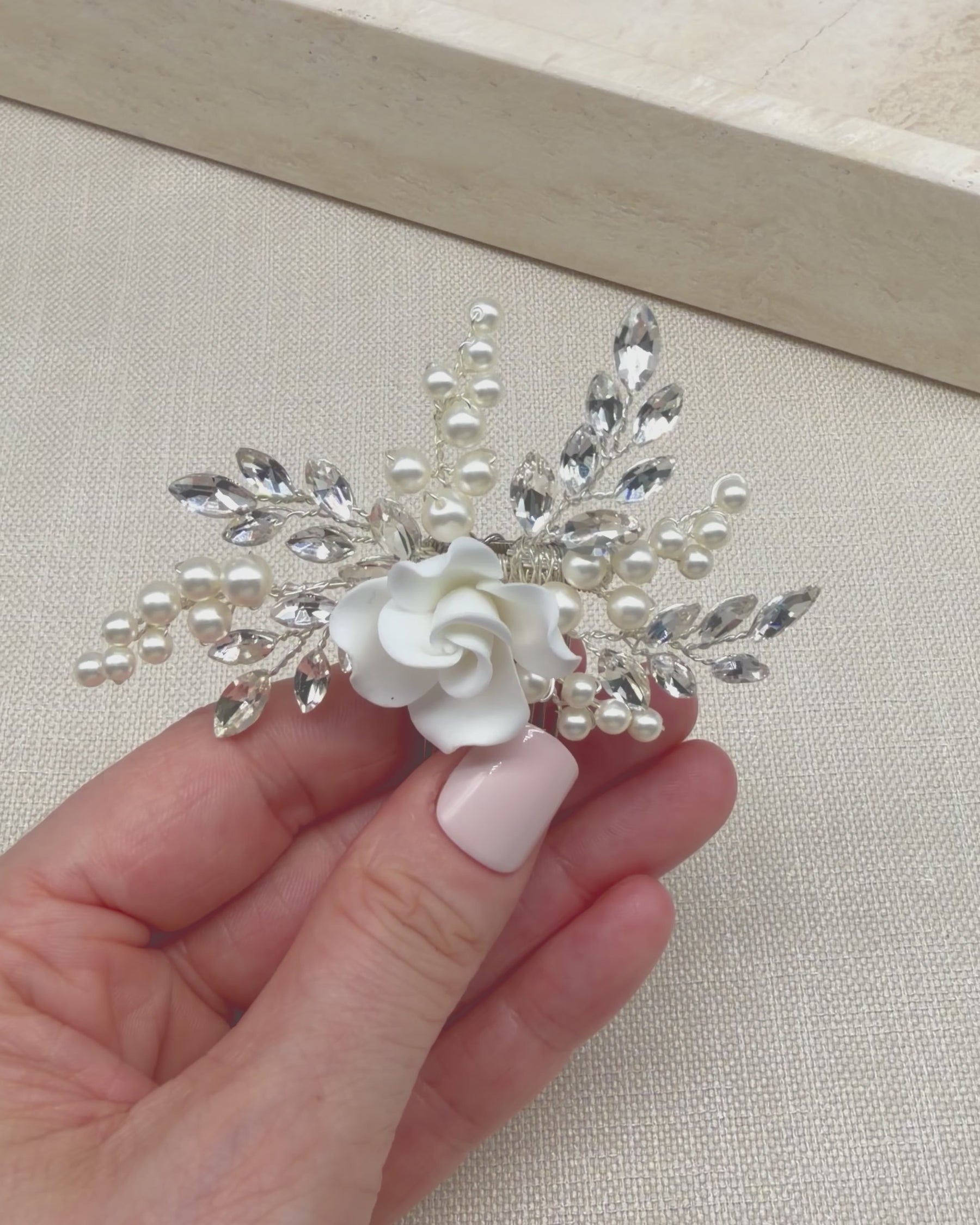 The Elora Comb balances modern texture with timeless romance. A sculpted white bloom anchors the design, while sprays of pearls and crystals create a soft, organic silhouette. It tucks securely into loose waves or an updo for a polished, effortless finish.