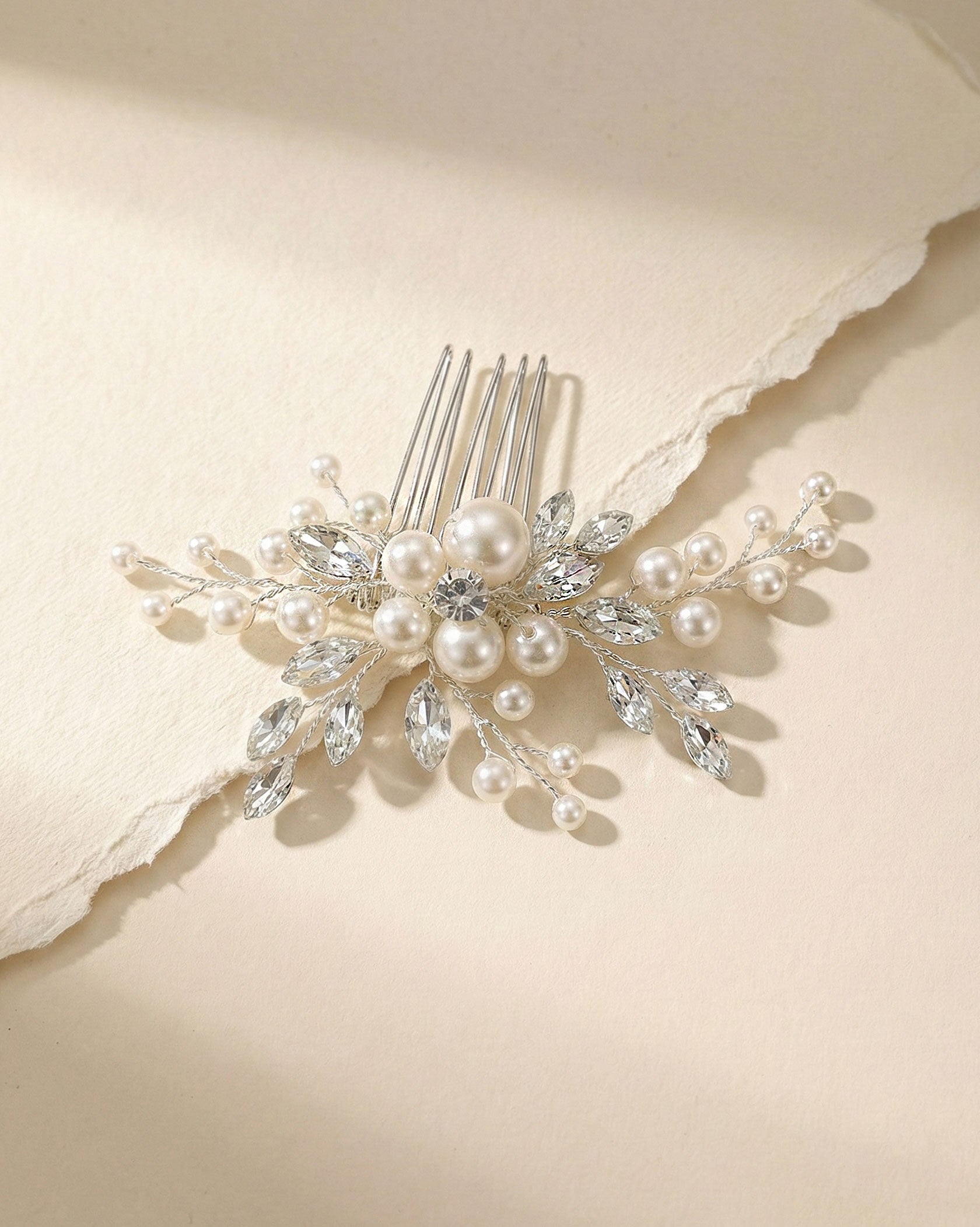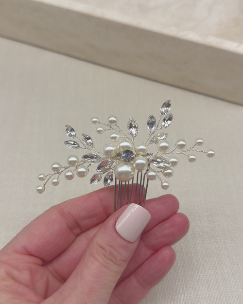 The Millie Comb delivers high-shine texture with a soft, organic finish. A cluster of off-white pearls and marquise crystals creates a botanical shape that feels effortless. It anchors securely into soft waves or a sleek updo for a deliberate and polished bridal edit.